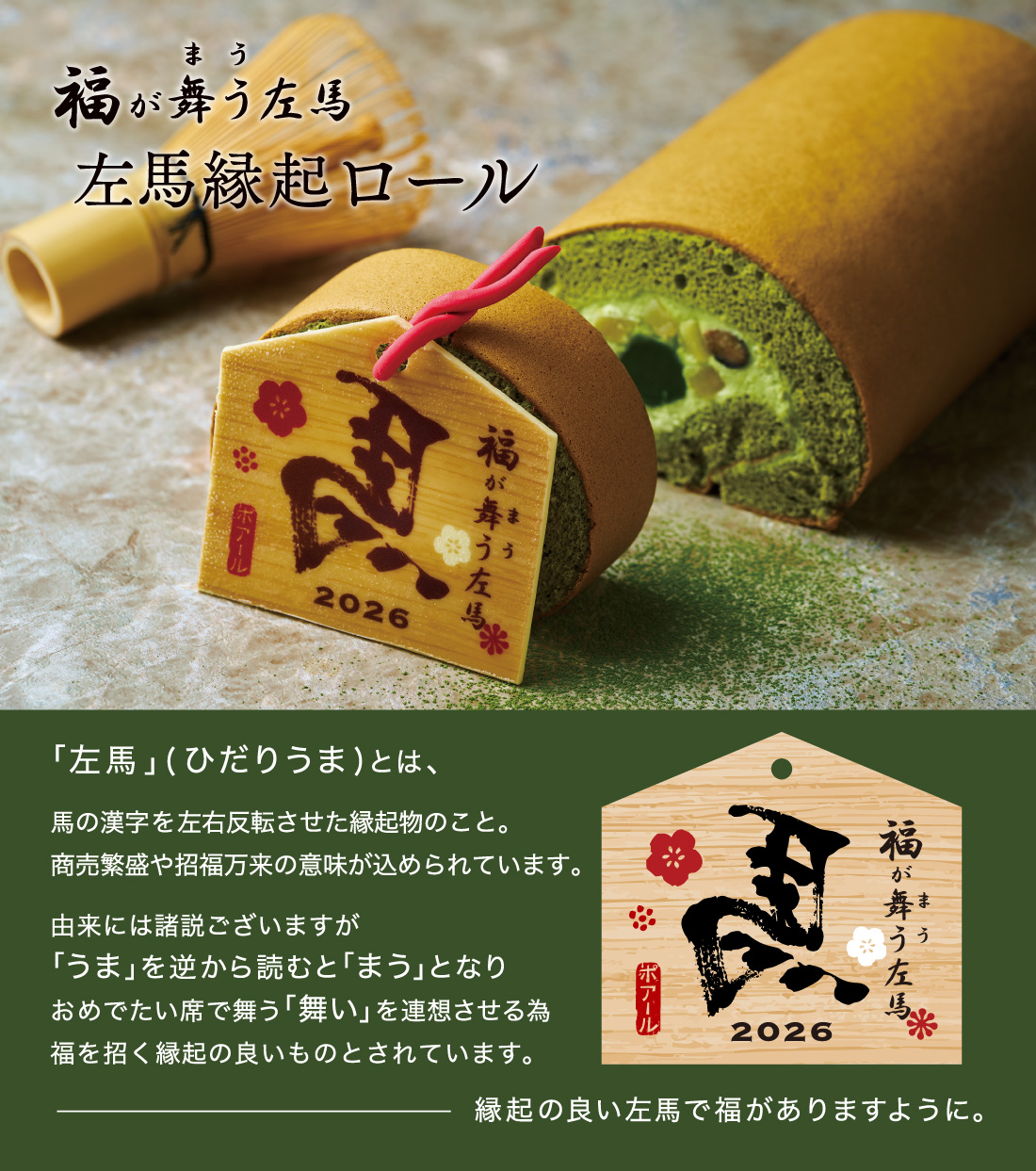 栗と黒豆を宇治抹茶生地で包み込んだ絵馬付きロールケーキ