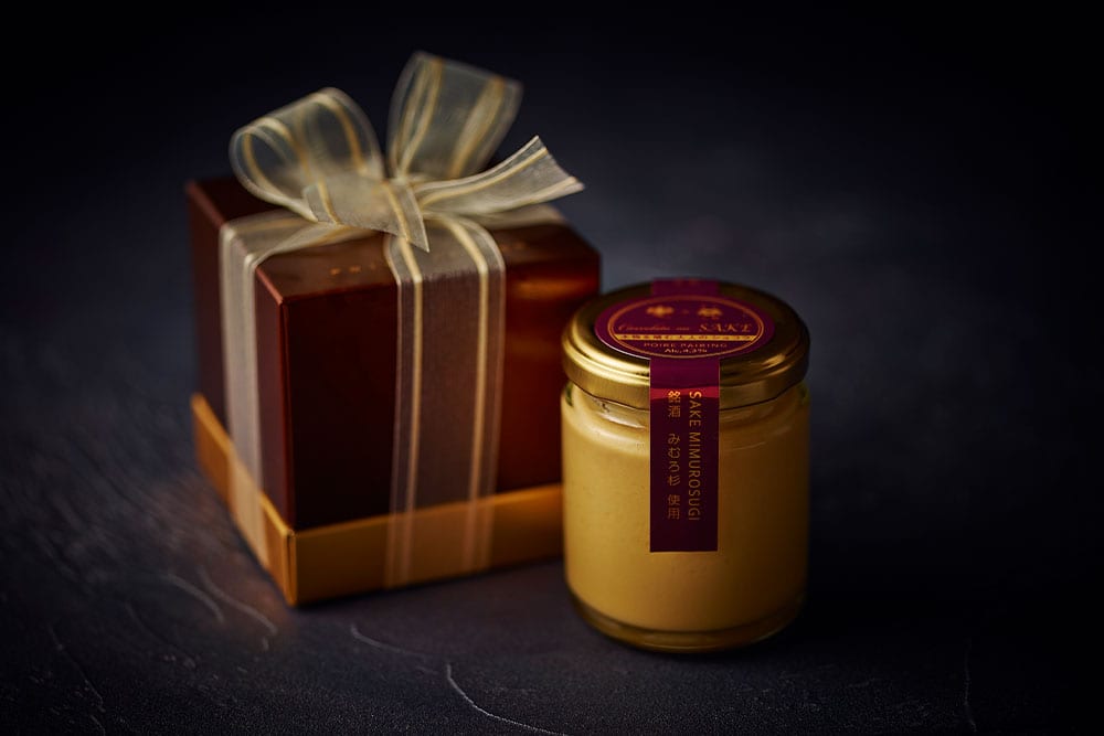 お米のふくらみある甘みと旨味に留意し醸した純米吟醸「みむろ杉」。日本酒の上品でフルーティーな香りに乳味感あふれるホワイトチョコと隠し味の酒粕が絶妙な“味わい深い大人スイーツ”