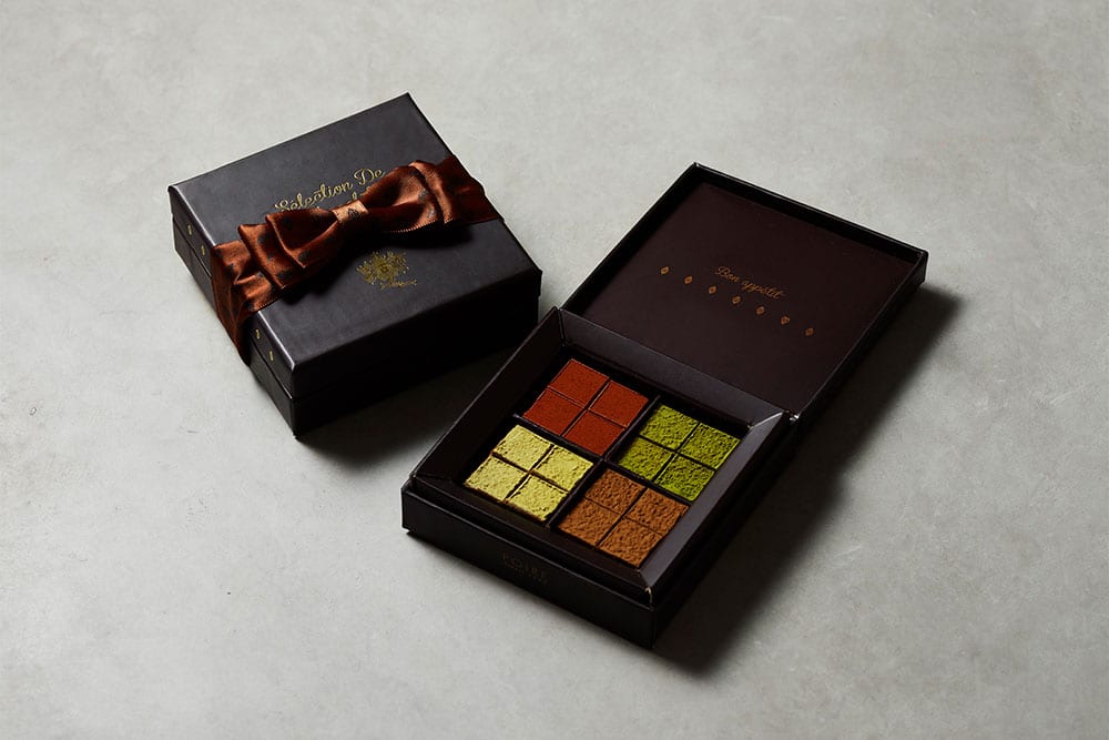 ココアが香るパヴェに加え、香ばしい風味豊かなほうじ茶味と玄米茶味、上品な抹茶味を組み合わせました。絹のようなくちどけが美しい逸品をお楽しみください。